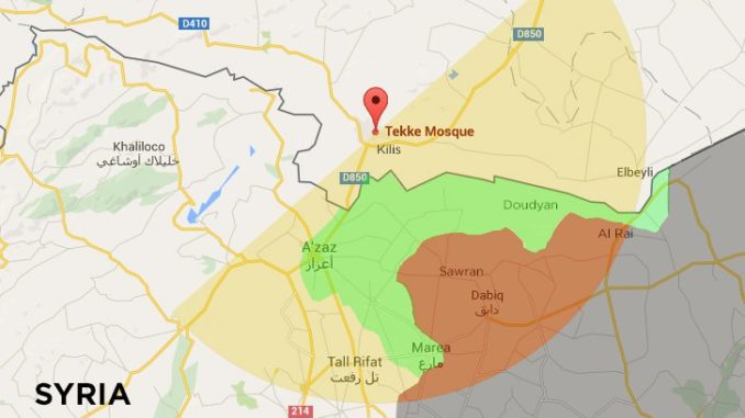 (Roketlerin geliyor olabileceği alan sarı yarım daire ile gösterilirken, yeşil alanlar “muhaliflerin” elindeki yerlerini, kırmızı ise IŞİD’in olduğu bölgeyi temsil ediyor.)