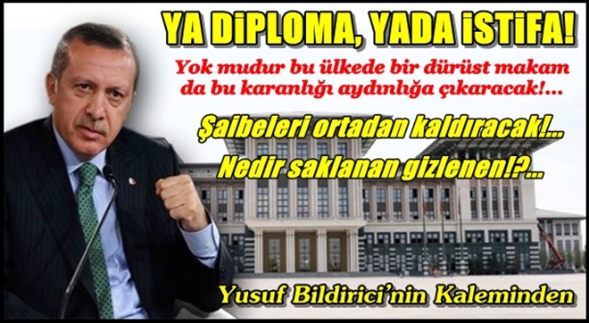 Hal böyle ikin Sayın Recep Tayip Erdoğan´da bütün bu olanlara karşı ne diplomasını çıkartıp gösteriyor, nede kafalardaki soru işaretleri kalkıyor.. Ülkemin en üst makamında oturan kişinin öğrenin durumunu sormak en doğal hakkımız olduğundan, bir vatandaş olarak bir işe girebilmek için bizlerden istenen SAĞLIK RAPORU, DİPLOMA, SİCİL SABIKA KAYDI vs isteniyorsa şayet o zaman: Askerliğini yapmış, Türkiye Cumhuriyeti vatandaşı olarak, Ülkemin en üst makamında oturan adamın Öğrenim durumu yani (DİPLOMASI) varmı?