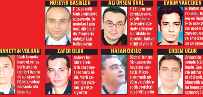 Ali Ünsem Ünal (17 Ocak 2007): 30 yaşındaki ASELSAN mühendisi Ünal, kafasına isabet eden tek kurşunla öldürüldü. İntihar ettiği söylendi. F-16 savaş uçaklarının modernizasyonu, komuta kontrol ve şifreleme sistemleri üzerinde çalışıyordu.