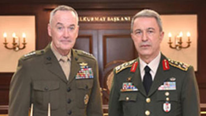 Amerika Birleşik Devletleri (ABD) Genelkurmay Başkanı Orgeneral Joseph Dunford, Genelkurmay Başkanı Orgeneral Hulusi Akar’la görüşmek üzere, bugün Ankara’ya resmi bir ziyarette bulunmuştu.