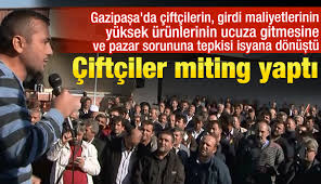 Antalya Gazipaşa haline günlerdir ürün vermeyen çiftçiler miting yaptı. Hal meydanında toplanan bini aşkın üretici hükümete taleplerini iletti. Gazipaşa’da çiftçilerin, girdi maliyetlerinin yüksek ürünlerinin ucuza gitmesine ve pazar sorununa tepkisi isyana dönüştü. Çiftçiler, hal meydanında yaptıkları miting aracılığıyla yaşadığı sıkıntıları anlattı. Üreticiler hükümete seslendi; çözüm istedi. Mitinge ellerinde Türk bayrakları ile gelen kadın üreticiler de vardı. Eylemden sonra traktör kasalarında söktükleri dikenli salatalıkları meydana getiren çiftçiler kendilerini siyaset yapmakla suçlayan kesimlere de yanıt verdi; Bir çok üreticinin söz aldığı mitinge CHP,MHP, Vatan Partisi ve Saadet Partisi ilçe başkanları da söz alarak destek verdi.